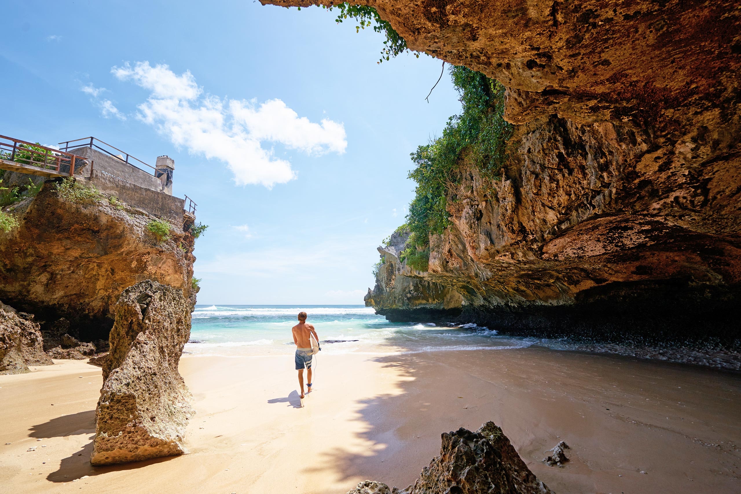 Uluwatu, the often unfairly forgotten southern tip of Bali on the Bukit Peninsula enchants with its rough charm. Rugged cliffs, high waves, sunburned vegetation and long, winding coastal roads create an atmospheric picture whose earthy tones are reminiscent of Greek islands.